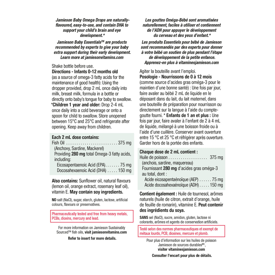 Jamieson Baby Omega Drops come with a convenient, easy-to-use dropper that can easily be used for Infants 0-12 months and Children 1 year and older. The drops can be added into milk, break milk, formula in a bottle or directly onto baby's tongue for baby to swallow. For older babies and toddlers, the drops can be added onto milk or onto a spoon for child to swallow.
