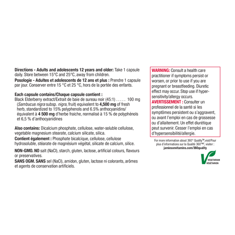 Jamieson's Black Elderberry is comprised of 100 mg of Black Elderberry extract to help relieve symptoms of colds and flus such as coughs, sore throat and mucus buildup of the upper respiratory tract. This one-a-day formula is suitable for both adolescence and adults and is DNA verified to guarantee ingredient authenticity.