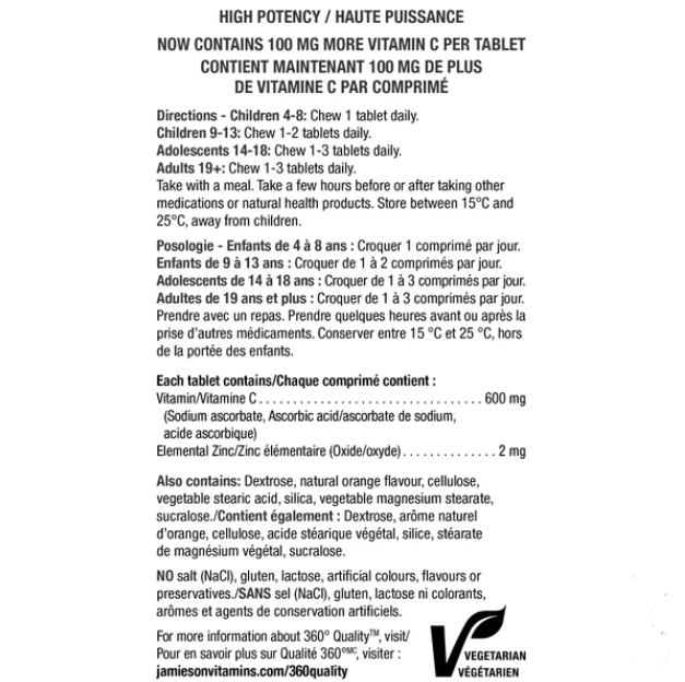 Jamieson Chewable Vitamin C + Zinc 600mg, 340 tabs