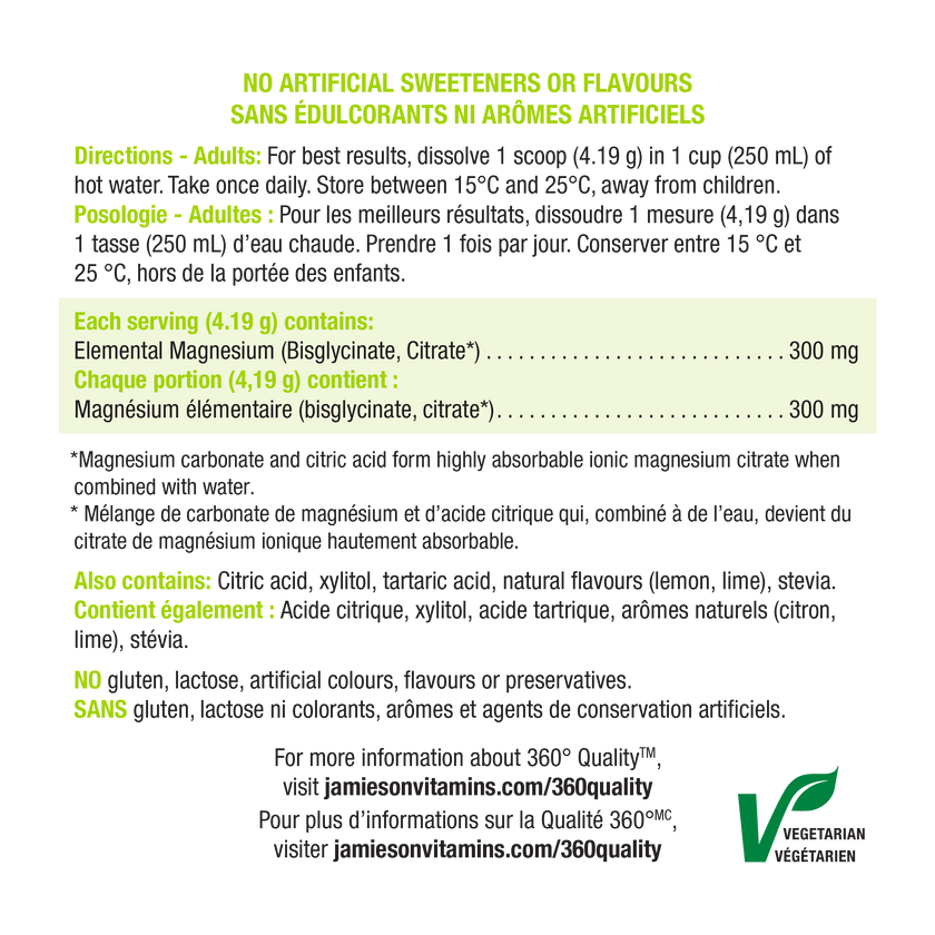 Jamieson Magnesium Powder provides an easy, potent and fast absorbing alternative to getting your daily dose of magnesium. The delicious natural lemon-lime flavour is free from any artificial sweeteners or flavours. Just mix with water and enjoy!