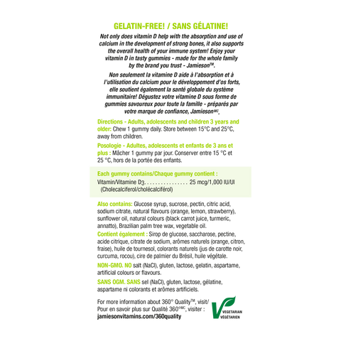 Jamieson Vitamin D3 Gummies 1,000 IU are great tasting, all-natural gummies delivering 1,000 IU of pure, naturally sourced vitamin D3.