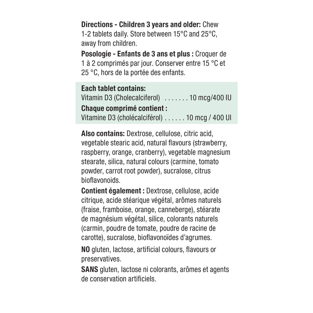 A Vitamin D supplement just for kids! Our new strawberry-flavoured chewable tablets provide the ideal daily dose of disease-fighting sunshine supplement. Kids will love the fun panda shapes and the summer-sweet strawberry flavour, made without artificial flavours or colours.