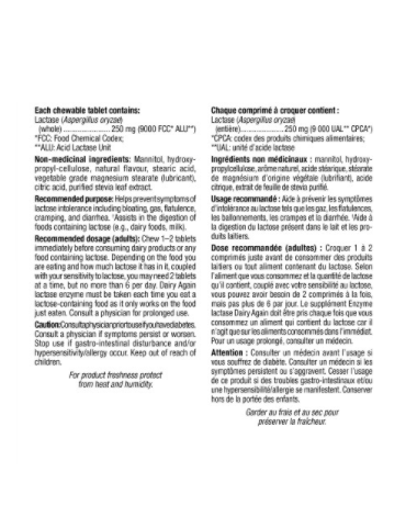 Recommended dosage (adults): Chew 1–2 tablets immediately before consuming dairy products or any food containing lactose.