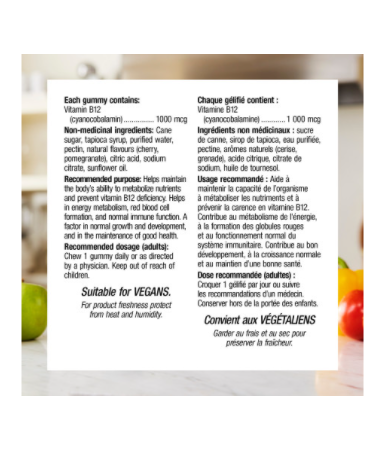 Each gummy delivers 1000 mcg of vitamin B12, and is gluten free and made with non-GMO ingredients. The delicious natural cherry-pomegranate-flavoured gummy is convenient for adults looking for an alternative to capsules, tablets, and injections. This formula is suitable for vegetarians and vegans and supplies a daily dose of essential vitamin B12 to support good health.