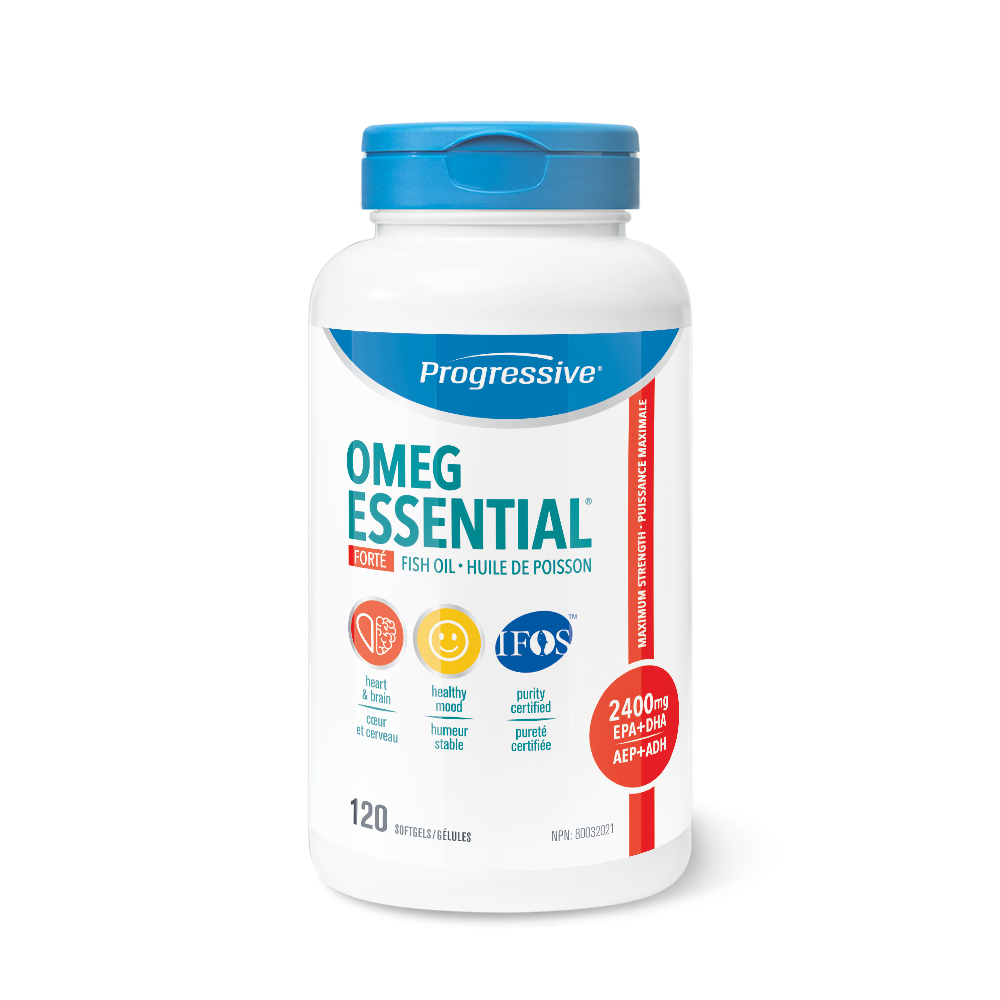 漸進式 OmegEssential® FORTE 最大強度魚油旨在提供更具治療性的劑量,以應對特定的健康挑戰。這包括促進健康的情緒平衡,支持心血管健康並有助于降低血清甘油三酯。每份提供 1,600 毫克的 EPA 和 800 毫克的 DHA,比例爲 2:1 的平衡