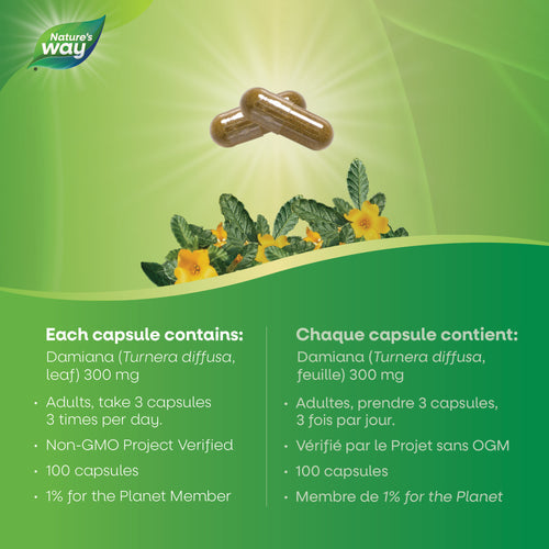 Nature's Way 達米阿那葉傳統上在草藥中用作神經滋補劑和利尿劑,有助於緩解泌尿道的一般刺激。 Nature's Way Damiana Leaves 已通過素食和非轉基因項目驗證。