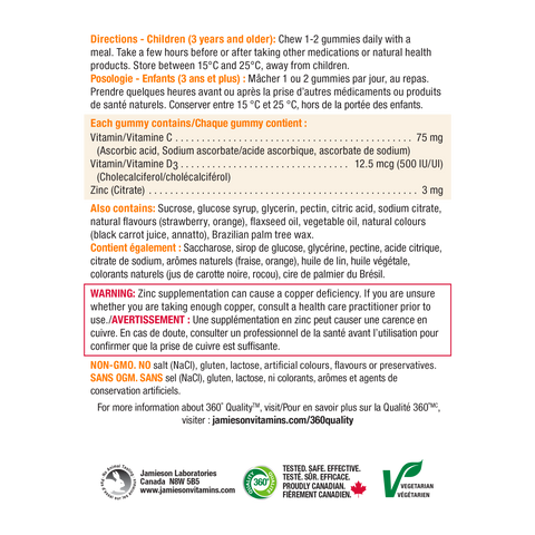 Jamieson 兒童維他命 C + D3 鋅軟糖,美味又有趣,幫助您維護孩子的健康。每顆素食水果口味軟糖富含 75 毫克維生素 C、500 國際單位維生素 D3 和 3 毫克鋅。