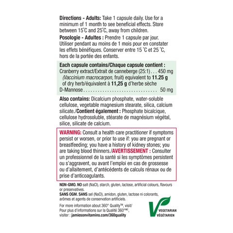 Jamieson 極濃縮蔓越莓複合物含有 450 毫克蔓越莓和 50 毫克 D-甘露糖,有助於治療和預防泌尿道感染。每粒膠囊萃取自 500 毫克新鮮純淨的蔓越莓濃縮汁。