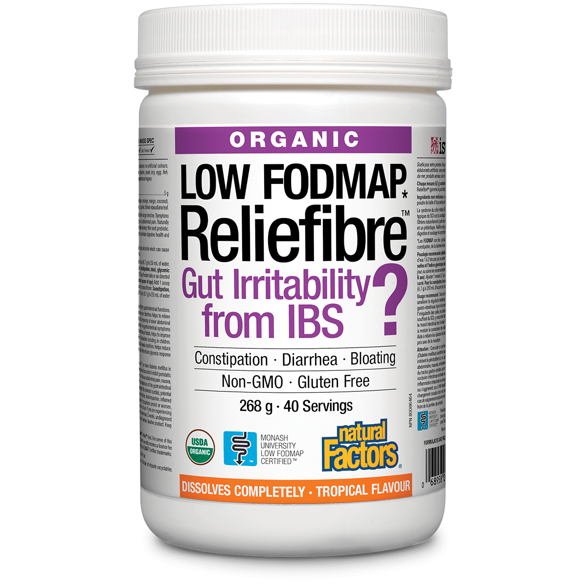 每份有機救濟纖維均提供5克低FODMAP有機,非轉基因,無麸質纖維,以支持患有IBS的個體。 Reliefibre還可以幫助您控制長時間的飽腹感並支持血糖調節,從而控制體重。 Reliefibre適用于素食主義者和素食主義者,提供無味和美味的天然熱帶風味。這種益生元纖維可用于8歲及以上的成人和兒童,以緩解便秘和IBS症狀。