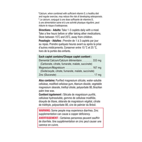 鈣與鎂鋅能維持強健的骨骼和牙齒,並有助於預防骨質疏松,減少骨折的風險。該產品可以幫助降低高血壓和在緩解PMS癥狀。它還有助於防止失眠,有利於青少年和絕經後的婦女。同時加入葡萄糖酸鋅增強免疫系統,抗擊感染和支持前列腺健康。