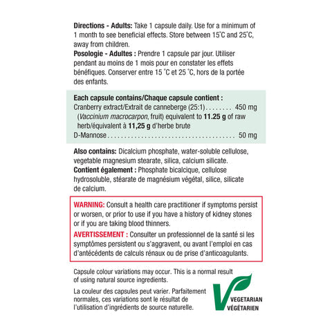 Jamieson最大濃縮蔓越莓複合物由450毫克蔓越莓和50毫克D-甘露糖組成,有助于治療和預防尿路感染。 每粒膠囊均來自500毫克新鮮純蔓越莓汁濃縮物。