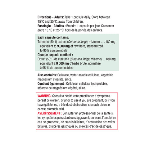 180 mg相當于9,000 mg原始藥草,標准化爲95%姜黃素