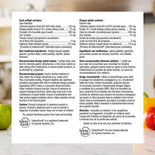 每粒軟膠囊含有:鋸棕櫚 (Serenoa repens)(果實)(85–95% 脂肪酸)125 毫克蕁麻提取物 10:1(蕁麻)(根)75 毫克南瓜油 (Cucurbita pepo)(種子)480 毫克鋅(檸檬酸鹽) 15 毫克番茄提取物(Lycopersicon esculentum)(果肉)(6% 番茄紅素)5 毫克硒(高硒酵母)[由 SelenoExcell®(釀酒酵母)提供]55 微克